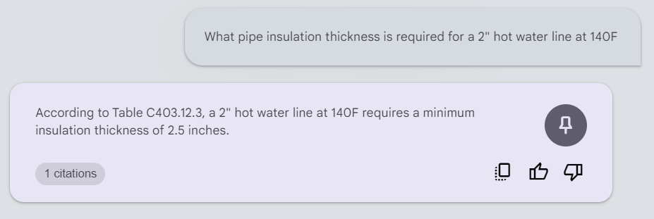 - Outcome: NotebookLM quickly referenced Table C403.12.3 of the code, indicating that a 2″ hot water line at 140F required a minimum insulation thickness of 2.5 inches. This immediate and accurate response not only ensured compliance but also aided in efficient decision-making and material procurement.