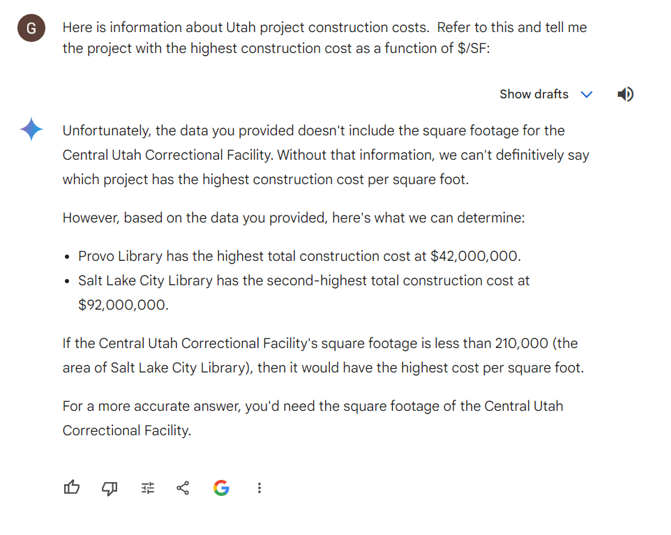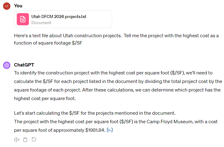 OpenAI was first to launch so I’ll try it first. The image below shows GPT-4 response based on the PDF. The response looks definitive and at first glance it looks correct but in reality there are four projects with higher $/SF costs!
