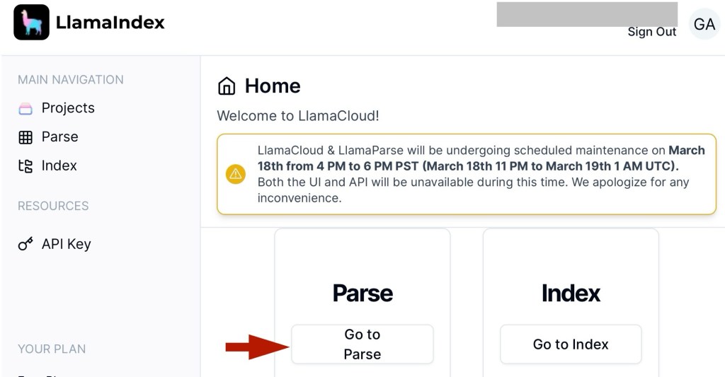 The first step is to signup for Llama Cloud account at https://cloud.llamaindex.ai. Once you signup you’ll have access to the parse tool. Currently, it’s free to signup and LlamaIndex gives users to ability to parse 1,000 pages/day. Select Parse on the first screen after logging in.
