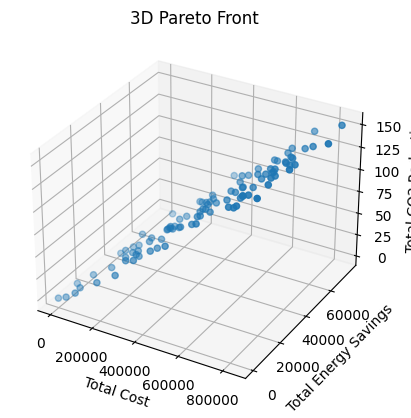 In this case, the decision-makers can apply an algorithm like NSGA-II to generate a Pareto front that represents the various trade-offs between energy savings, CO2 reduction, and cost. By analyzing the Pareto front, the business can identify the combination of EEMs that best aligns with their sustainability goals and budget constraints.